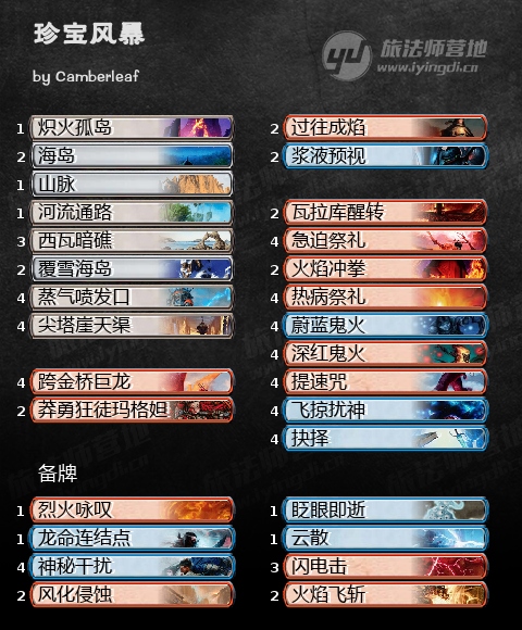 跨金桥巨龙这张单卡深得我的喜爱,它不仅是一个强度合格的生物(五费4/4飞行敏捷还带正面效果),还具有相当的组合技潜力。Camberleaf带来的这套珍宝风暴尝试利用它的组合技能力取胜:我们凭借急迫祭礼和热病祭礼尽早结算跨金桥巨龙,然后用深红鬼火、蔚蓝鬼火和提速咒这些牌指定它为目标,在快速过牌的同时还能得到大量法术力。如果牌序实在不够好,我们还可以施放过往成焰返照坟场的咒语,把以上过程再进行一遍。最终,我们会拿到火焰冲拳,配合提速咒让跨金桥巨龙一击爆头!这套牌的竞技性或许比不上传统的风暴套牌,但它的思路足够新奇,牌序较好时也能够打出精彩的操作!