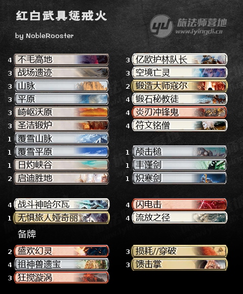 来看看NobleRooster带来的第二套构筑!第一眼看上去,这是一套红白剑,尝试用传统的武具思路赢下对局;实际上,我们还有另一个游戏计划——用炎刃冲锋鬼和诸境之剑的组合成为摩登赛制的“惩戒火”。套牌思路很简单:用诸境之剑结附炎刃冲锋鬼,然后进攻对手。如果炎刃冲锋鬼在战斗中死去,它会对任意目标造成三点伤害,然后诸境之剑的异能触发,将炎刃冲锋鬼移回我们手上。这个仅需三费的流程每回合都能循环一次,对手阻挡与否都会吃到三点伤害。套牌的其他部分能够进一步加强这个游戏计划:无惧旅人娅奇丽帮助补充手牌,战斗神哈尔瓦给到炎刃冲锋鬼连击,锻造大师寇尔也能提供额外的保护。这套牌在现在的摩登赛制表现如何还不好说,但它看上去的确有着一战之力!
