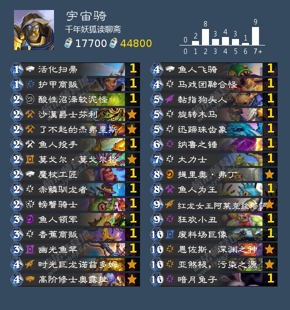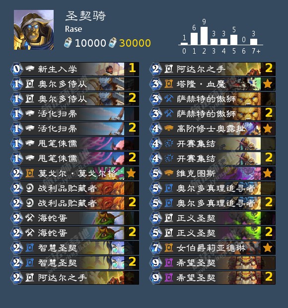 来自营地用户千年妖狐读聊斋投稿的一套宇宙骑,他用这套卡组以73%的胜率从传说2500名打到了传说900名。与宇宙体系的其他卡组(宇宙牧、宇宙法)相比而言,宇宙骑是一套中速卡组,整体思路更偏向于随从站场来进行场面交换,而了不起的杰弗里斯和沙漠爵士芬利能够提高卡组的快攻抗性,同时恩佐斯,深渊之神与宇宙体系十分搭配,以牺牲鱼人为王效果为代价增强了卡组后期铺场能力。这套宇宙骑最大的特点在于面对除了决斗法以外的套牌几乎都有一战之力,打刀贼和瞎子有两张软来应对,打后期卡组可以通过鱼人为王铺场+了不起的杰弗里斯找嗜血带走。所以这套卡组在决斗法不是很多的环境中十分值得尝试,同时千年妖狐读聊斋也发了关于这套卡组使用的帖子,感兴趣的玩家可以去查看。