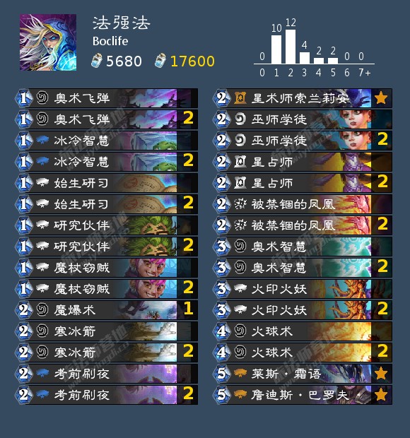 ,这套卡组没有选择带上魔法订书匠,奥术守望者,巫术替身等需要站场打配合的牌,而是带上了冰冷智慧,火印火妖等来抗快组件,因而快攻抗性更好,但相比之下的缺点就是伤害有限,在对阵牧师战士等职业时有时会出现伤害不足的情况。或许是考虑到这一点,Boclife选择重新带上了星术师索兰莉安,来在某些对局讲故事。需要注意的是对阵牧师时可以考虑自己解掉索兰莉安(尤其是后期时),避免被对面暗影狂乱/灾祸/313后把终极随从解到牧师牌库等情况的发生。