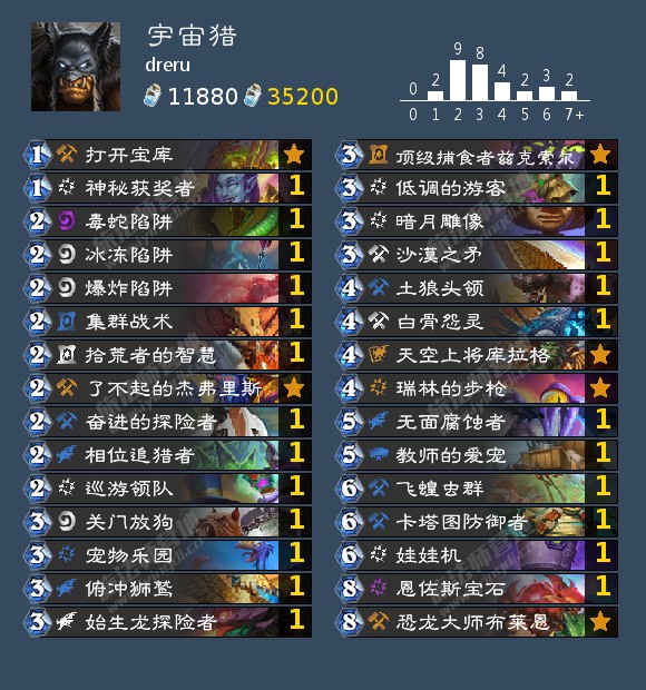 来自营地用户dreru投稿的一套宇宙猎,他以72%的胜率打上传说。卡组融合了突袭、奥秘、亡语、宇宙等多种体系,突袭体系可以帮助前期过渡(尤其俯冲狮鹫、娃娃机都是优质解场与过牌为一体),亡语体系进可前期护脸退可后期赖场斩杀;过牌体系是保证猎人拥有持久输出能力的来源;宇宙体系是中后期反攻的号角,铜须压血线姐夫解场斩杀非常普遍;奥秘体系是所有体系的粘合剂,毒蛇铺场、集群赖场、爆炸冰冻互脸,还可以配合相位追猎者、低调的游客滤牌。基于以上特点,这是一套偏厚的中速卡组,卡组的发力点在任务完成的当回合。由于这一套比一般任务猎偏厚,任务完成时间也靠后,大概在第十回合左右,但是相较于传统任务猎,由于恩佐斯宝石为终结点的亡语体系加入,发力点在爆发力之余也有了持续性,无论复活终极随从增加牌库资源打消耗,还是复活卡塔图防御者、教师的爱宠增加赖场能力,都与技能相性非常好,所以亡语体系的存在保证了后期能力的下限,可以放心一波一波拖回合数持续施压,不用像传统任务猎一样过分追求前期节奏蹭血。卡组间有不少灵性的combo配合,在猎人趋于隐藏的当下,是很有意思值得一试的套牌。