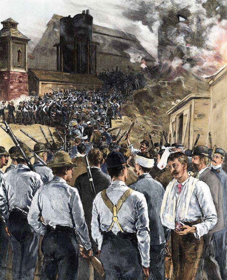 显而易见 卡内基 不喜欢当坏人,但 弗里克 不在乎,他开始竭尽所能地压榨钢厂工人,每周工作六天,每天工作12小时。没错,996,弗里克的福报。在当时基本没考虑过什么生产安全的钢铁工厂里,这意味着工作条件超出了人的极限。有些工人因为过于疲惫开始出现大量工伤,这种非人的条件逼迫工人们开始成立工会寻找反抗办法,但换来的是 弗里克 变本加厉地压榨。终于,当一名工人死在工厂之后,工人们无法忍受了,既然横竖活不下去,他们决定揭竿而起,一场资本家和工人的直接冲突一触即发。