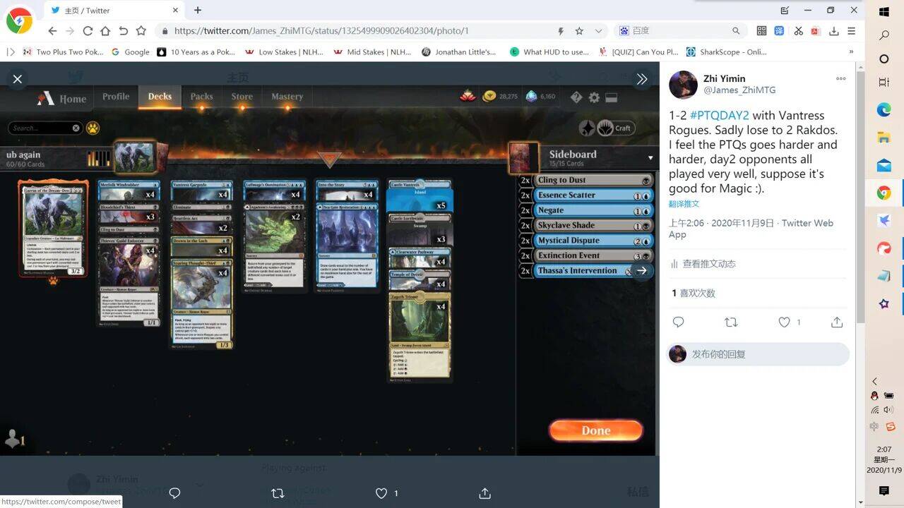 万智牌变了,我们打开了MTGA;2020年我们没有了GP;我们没有了专业积分和职业牌手俱乐部;赞助的牌店关了,我因为主动资助PT战队也经济拮据。打完了整个赛季,差1个秘稀积分能进MRL;打完了密西邀请赛,差1胜能q今年的世界冠军赛。似乎一切又得从PTQ开始了呀,从2017年全职万智牌之后我又一次站在了退坑的边缘。我回光返照般的准备再尝试回到这个我热爱的游戏,我想着可以试着用直播来增加一些收入来平衡MTGO的渐渐死去。赛前:我觉得也就红黑打不赢,碰两个死就死了... 结果:死了。