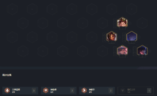 2阶段我们就是留取所有的三国卡,能开出3三国羁绊那么前期血量就会很稳,三国增加血量,这在前期优势很大,如果在有个日炎那么可稳定连胜。