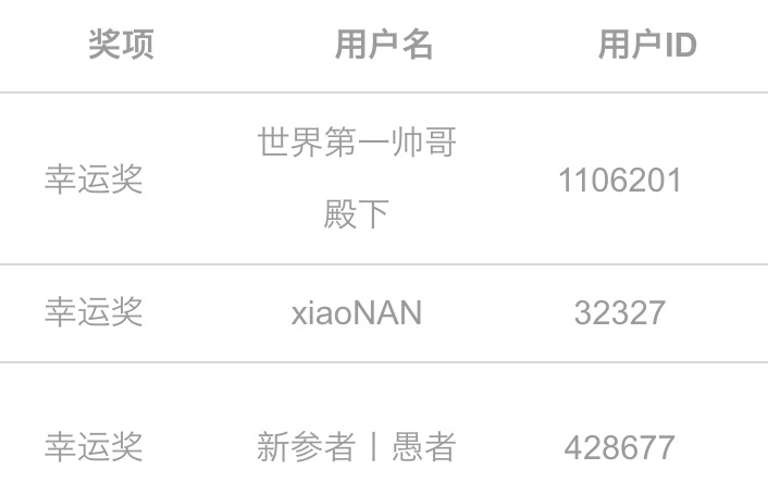 感谢各位老哥的参与,活动已结束,幸运奖为以下三位老哥,看到私信后请尽快和我联系。