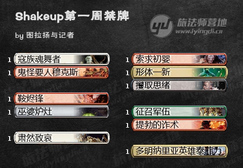 下面是第一周的禁牌,看起来就是把最厉害的几套牌的核心单卡都ban了,让大家组组三线套牌群魔乱舞。