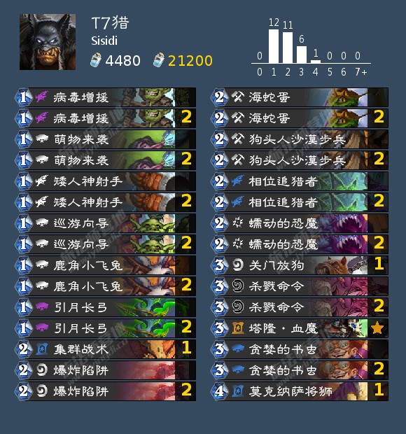 与传统T7猎相比,第一套卡组更偏向于站场并补充了一定的爆发。构筑上,这套卡组重新启用了外域版本的病毒增援-塔隆·血魔体系,并加入了莫克纳萨将狮和海蛇蛋来补强。为了(在一定程度上)克制(卡手的)铺场德,这套卡组满编了爆炸陷阱,这也是我比较疑惑的一个点——如果要强化站场的话,那毒蛇陷阱可能会更好?不过总的来说,在T7猎伤害端严格不优于快攻贼的现在,着力于站场还是一个值得扩展的思路。