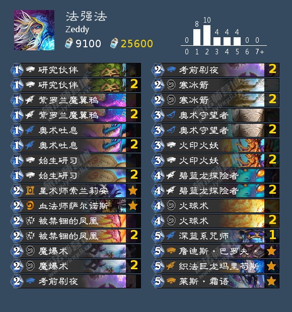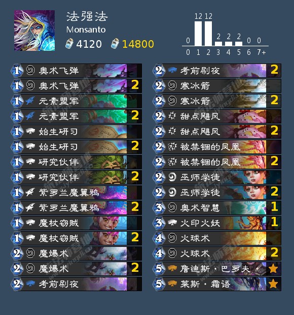 与此前搬运的Boc4life的法强法相比,这套卡组的站场能力更强,韧性上也不逊。奥术守望者3费5-6的身材很难被处理,而且在节奏上配合2费准时拍下的被禁锢的凤凰也很舒服;碧蓝龙探险者兼具法强、龙种、提供资源三重属性,前期打出压制力之后也可以用碧蓝龙+考前刷夜补充手牌。在暗月大小版本中并未补充新的1费法师法术,法师现在的1费法术还是控场、资源、伤害一应俱全,也没有真正意义上的“垃圾法术”(智慧秘典怎么说也能算是个资源,元素盟军也能配合被禁锢的凤凰和紫罗兰魔翼鸦过牌),因此携带本身可以当龙种的深蓝系咒师也很合理。织法巨龙玛里苟斯是这套卡组的一个变招,伤害、控场、过牌、补牌一应俱全。