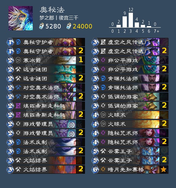 来自梦之郡丨後宫三千的一套奥秘法,胜率为70%并打出了十连胜的成绩。对空奥术法师和结界能完美解决德鲁伊的铺场,奥秘能卡超生德和决斗法的节奏,带了一张寒冰箭既是直伤也能控战士和盗贼一回合的脸;走私犯则主要用于补充资源,有时可以提供额外的奥秘。奥秘法在现今环境中能有一定的信息差,是值得一试的节奏卡组。