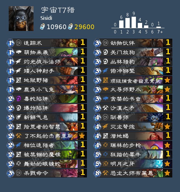 与宇宙T7猎相比,第二套卡组携带了一些质量来对抗控制。野兽最大的好处就是可以buff,进而将场面快速膨胀,从这个角度来说,这套卡组又与曾经的中速猎比较相似,中期主要思路就是铺场、buff、打伤害。明月之牙是一个应对控制卡组的质量卡,拿来站场也挺不错,而且本身也可以直接获得、无需合成。