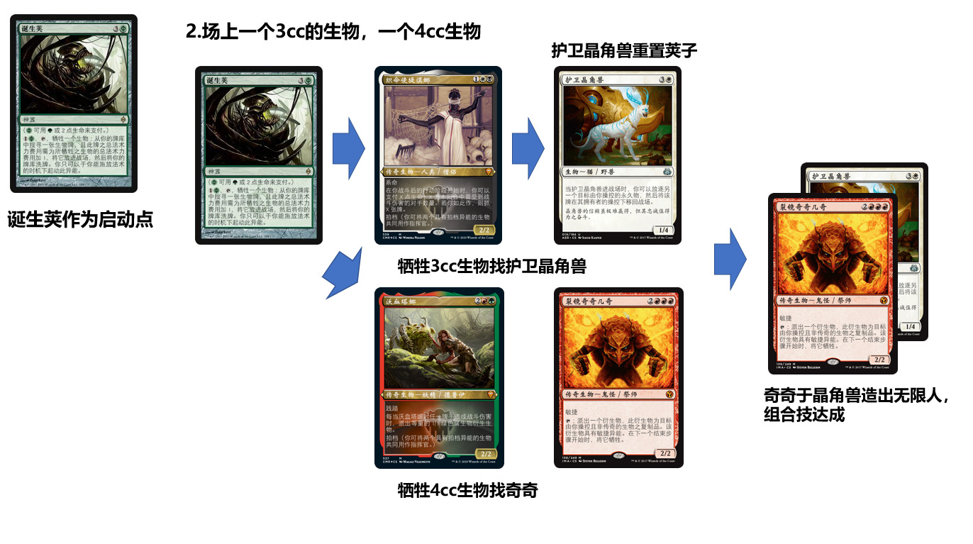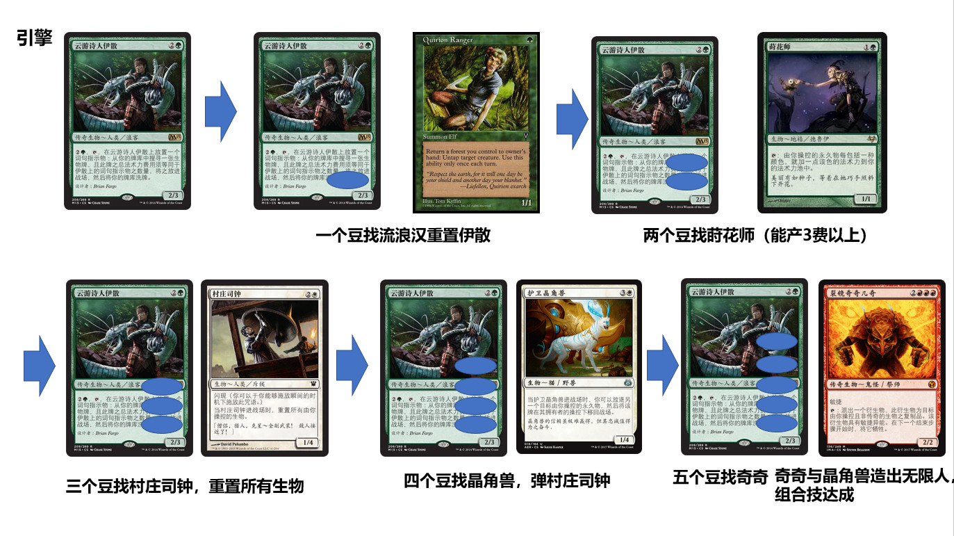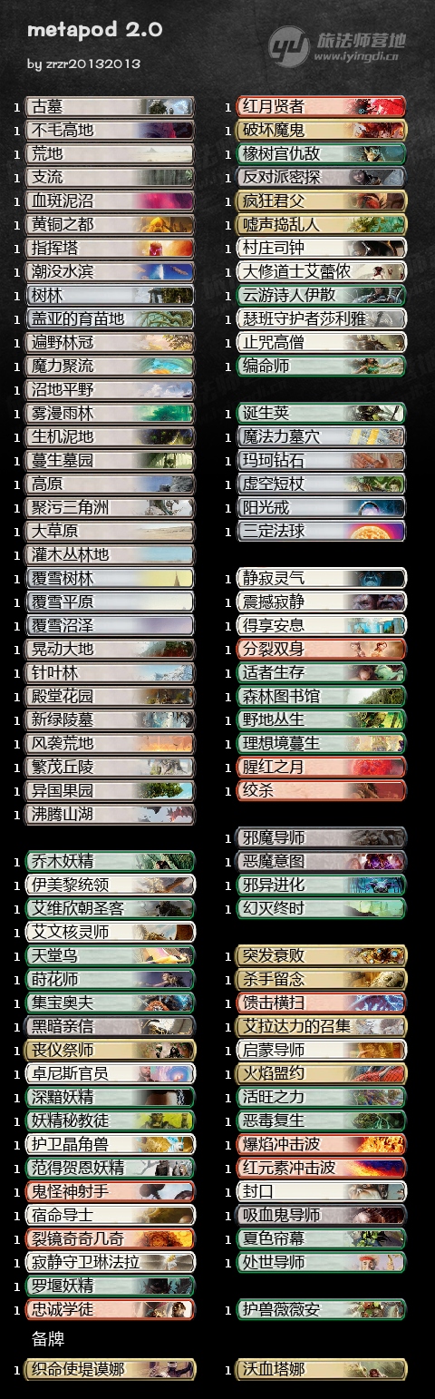 非蓝四色诞生荚 套牌(荚子套牌)是由原作者LabManiac_Luke 与 Lerker 两位大师共同创造的。荚子套牌本质是一个stax(锁)套牌,在用生物进攻对对手生命值造成压力的同时,利用stax积累优势,最后以荚子类组合技取得胜利。同时两个主将织命使堤谟娜 与 沃血塔娜 也是各司其职。 塔娜往往优先使用,作为场上的一个威胁,而后堤谟娜即使不攻击也能发挥作用,来赚取价值。这套牌几乎包含最全面的hate,也有着高密度的威胁,更像是一个巨大的工具箱。