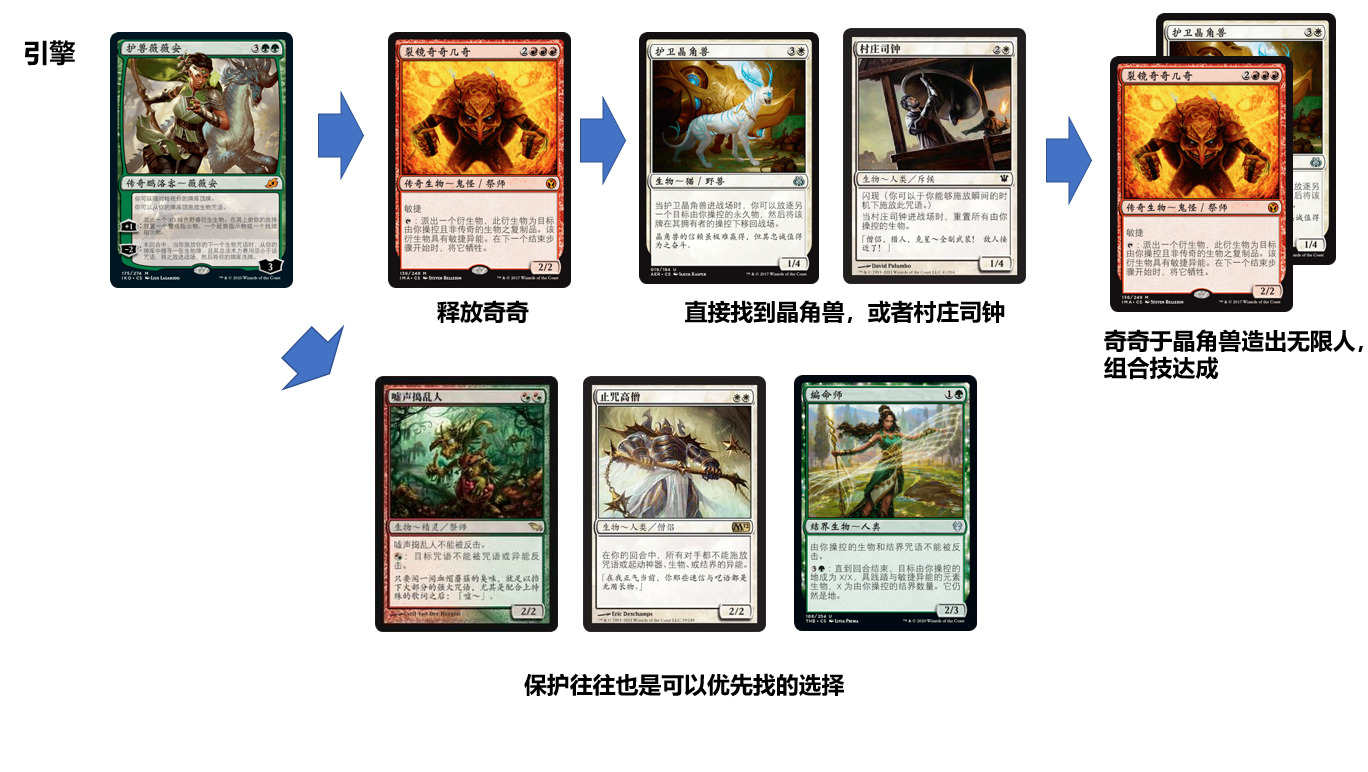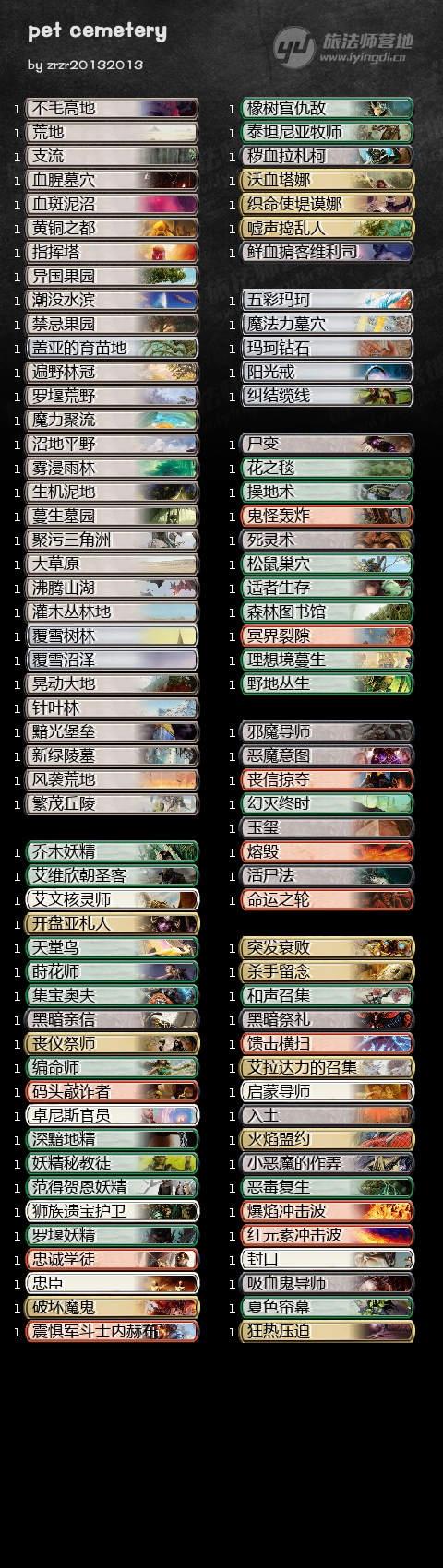 (1)与坟场相关:坟场当然就是填坟与挖坟,刚好我们的护卫晶角兽 与裂境奇奇几奇也都是从坟里挖出来的。所以一些填坟咒语(入土 ,活埋 ,适者生存 ,动物群祭师 ,丧心掠夺 ),以及挖坟咒语(尸变 ,死灵术 ,亡者之舞 ,忠臣 ,生命//死亡 ,活尸法 )显然就都是非常好的选择,都可以让你的套牌更快达成组合技。