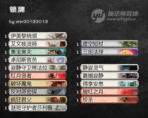 一提到锁肯定就会有人脸色难看,但是明确一点我们与四世等套牌的锁不同,我个人认为这套牌不追求死锁 ,我们没有蓝色没有塔萨先知恶魔协商 ,也没有现在大火的珍宝无限费与冥界裂隙 脑冻结 ,在组合技上面我们肯定是不够快,但是我们选择的组合技却和一些锁有较好的相性。