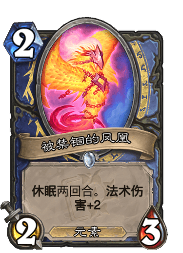 新版本拯救法强萨的其中一张卡,集三大优点于一身。其一,费用低,不卡手,随抽随用。其二,休眠以及法强+2高额收益,提供了OTK的可能性,凤凰苏醒那回合,配合法强刀和场上还存在的法强随从,利用本卡组的大量直伤法术,能一回合打出极高的斩杀。本卡组实战中,十几血的空场爆发是很常见的,我最顺时试过1回合空场28点的高额斩杀,而凤凰功不可没。其三,由于它的效果,它苏醒时对面不敢不解,是个软嘲讽,而它休眠在场上,也一定程度上也能起到震慑效果,让对手打出变形操作。