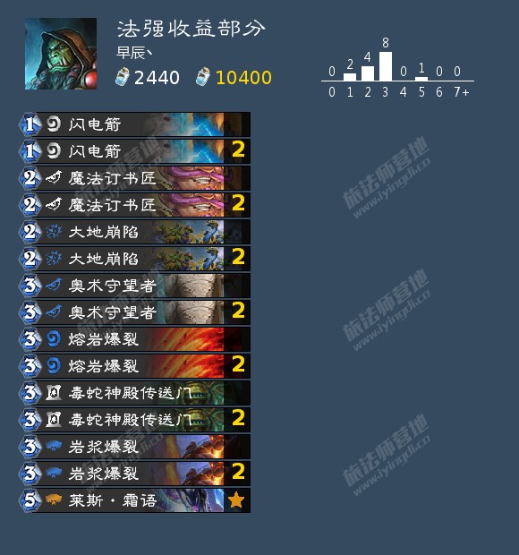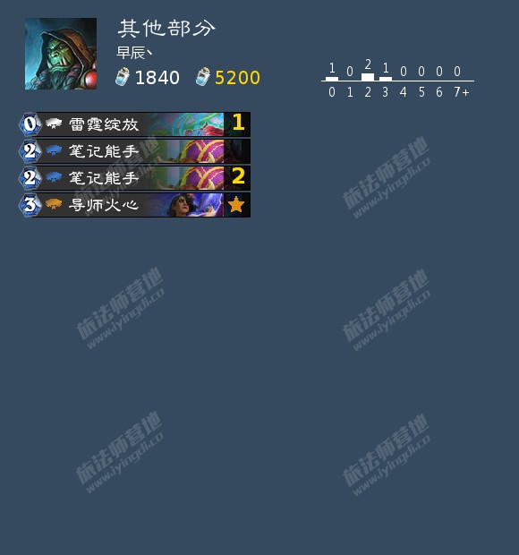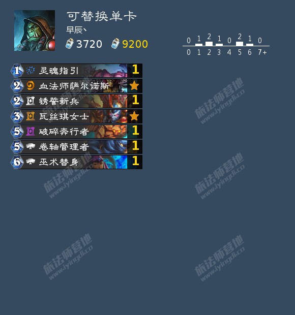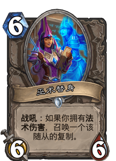 本身提供法强,费用较低,终极随从的效果也很强力。但是本身4-3的身材还是差了点,在当今的环境下,很容易下场就死,例如被盗贼的3攻随从,牧师的惩击,德鲁伊的月食,圣骑士的双盾优等生完克,横向对比奥数守望者,身材实在是太差了。而且本卡组也比较缺过牌,终极随从也很难上手,所以还是不太推荐携带。