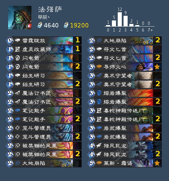 大家好,我是早辰丶。从暗影崛起开始,每个版本都有几张与法强配合的单卡,但无奈都是些碎片,一直撑不起一套牌的强度。但随着暗月小版本的到来,大地崩陷和被禁锢的凤凰的加入,法强萨终于得到了它的最后两块碎片,得到了一大波补强,迎来的他的春天,我认为如今的法强萨有T1的实力。在新版本发布后,我用新法强萨卡组,自1月22日开始,1月24日截止,进行了89把对局,胜率高达70%。