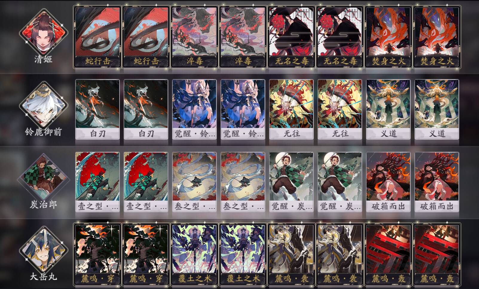 炭治郎构筑满编觉醒是一定的,这个没有问题。因为是快攻碳,所以一二勾战斗牌要满编,破箱而出可以理解为一张5-7形态加一次出击,在快攻卡组中收益是很高的。但是这样一来,兄妹之绊这样的强站场手段就无法编入,生生流转自然也难以运用。构筑卡组时还是要明确目的,如果卡组整体思路就是进攻,或者说加入这名式神的目的就是进攻和站场,那就专注于这方面的牌即可,即使有强度更高或上限更高的牌,也不会放在第一位置考虑。