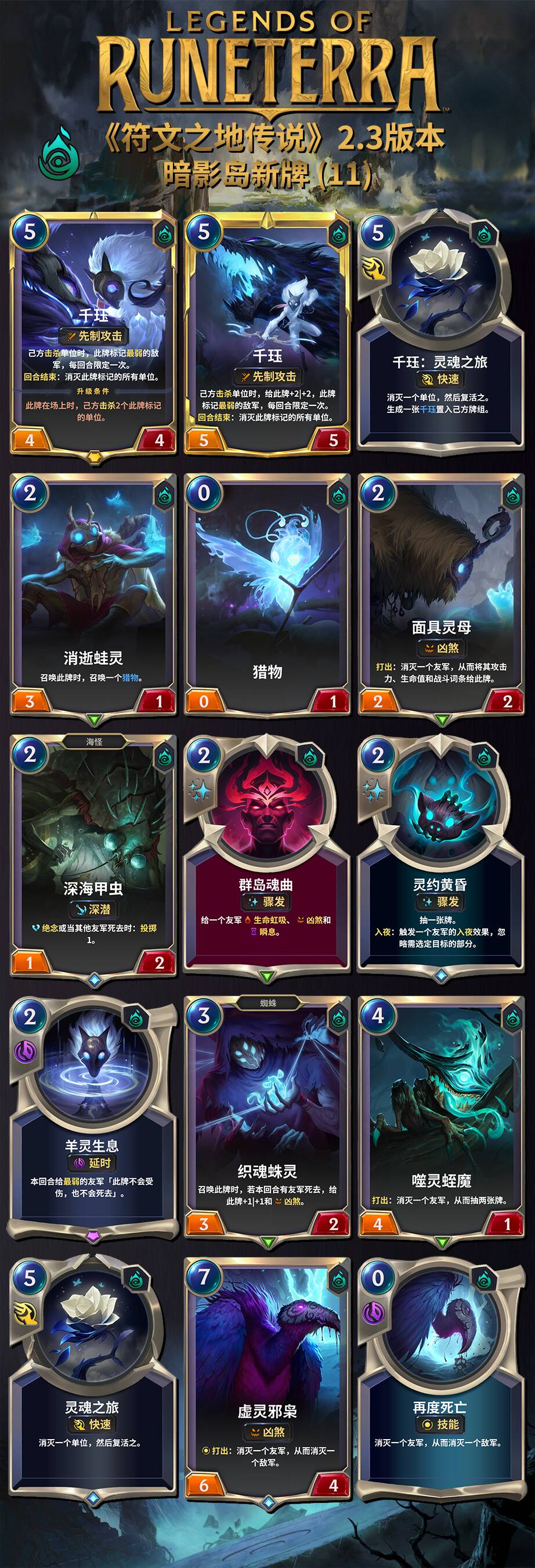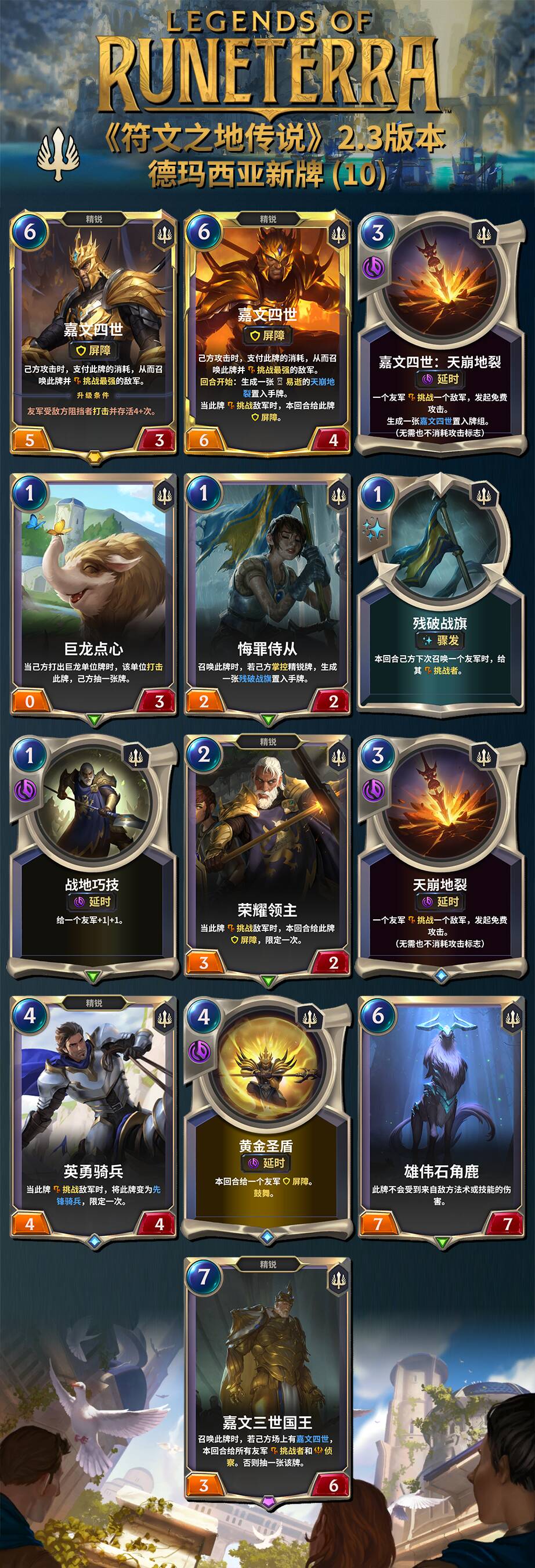 LoR现有8个地区的629种可收集卡牌,2.3版本将会新增第9个地区和110种卡牌。