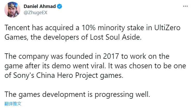 今日分析师Daniel Ahmad发推表示,腾讯已收购国产游戏《迷失之魂》开发商UltiZero Games工作室10%的少数股份。目前游戏的开发顺利,尽管官方已经有很长一段时间没有公布过新进展了。