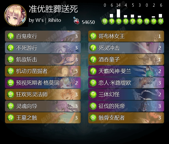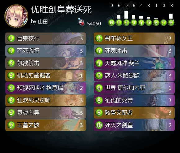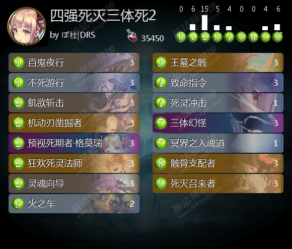 死灵 14:葬送死8(剑皇3、剑皇+三体2、三体2、连携1)、死灭三体死5、快攻死1