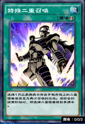 装给二重怪兽之后,会直接变成二重状态。在大部分情况下,用一次通召机会把二重怪兽二重召唤都是非常吃亏的。这张卡可以直接变成二重状态,并且在离场之后原本怪兽会再次变成通常怪兽可以增加二重机会。表侧的此卡送墓时可以苏生墓地的通常怪兽,不限制等级,同时是必发效果。除了苏生二重怪兽之外,还可以苏生青眼白龙。