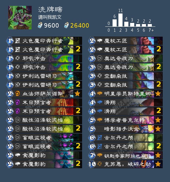 沃金的加入让最终版本的洗牌瞎一气呵成,我早在通灵学院版本发布过一个详细说明洗牌瞎的文章,如果对于这套构筑有点迷惑的营友可以去看一下。对比上个版本的变化,我可以说这套洗牌瞎的流畅度很高了,上个版本在头没有减费到滑翔钥匙的时候我们必须先拍下豹子才能启动,这意味着我们会面临多一个回合的不确定性,很容易面对一个爆炸的场面而没有办法洗牌,如果豹子用完了,我们就没有任何机会洗牌了,有了研习我们可以选择在任何时候洗牌。还有这套卡组确实面临一个要怎么赢的问题,我上版本是带的档案员,但不能算制胜手段,而且容易卡位置,现在有克苏恩可以作为终结手段,而且节省出了一些解场卡位,碎片不容易卡位置。卡组加入沃金以后我减少了随从数量,增加了两个奔行者来配合打出1+沃金换钥匙+滑翔的combo。有时候会遇到滑翔就位然后一直没有抽到钥匙的尴尬情况,所以用博学者增加钥匙上手的概率,钥匙在手上的情况,也可以通过头颅过碎片帮助解场。