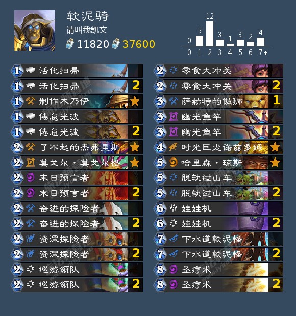 通灵学院上线以后我应该是第一个玩倦怠光波软泥怪扫把,当时的配合的是智慧圣契和单甩笔,这套卡组对于牌序要求较高,需要考虑前期过渡,活到9费10费,key牌较多,过牌非常依赖圣疗,奶量较少。前段时间受到跳费骑启发,我重新思考了这个体系,不讨论奥露拉任务的情况,跳费骑是在手上有小丑和10费的时候可以打一个快速超展开,缺点是前期场面压力大1077不一定能护住脸,面对控制卡组一两波小丑也不一定能压死,因为这个体系只是架墙等对面解,而不是主动的解站一体,而软泥体系可以做到场面的两级反转。不过u1s1跳费骑胡起来还是厉害的。下面我想解释一下为什么放弃9费10费的combo而选择要求更高的11费。首先对于笨重的骑士来说有硬币会让手牌比较灵活,然后我们可以看一下9费10费combo比较好用的卡:欢乐的同伴,圣契(单甩笔),沙尘吐息,力量祝福,智慧祝福爆牌。如果实际对局让我们不得不放弃上限的时候,这里的任何一张卡对于当前回合的意义都不大。再看一下11费combo比较好用的卡:巡游领队,零食大冲关(阿达尔之手,光铸祝福)。不难发现,在不考虑上限的时候这两张卡也能有不错的发挥,而且零食大冲关可以拿来找沙尘吐息力量祝福,也可以是一口奶,也可以是奉献过渡,比较灵活。