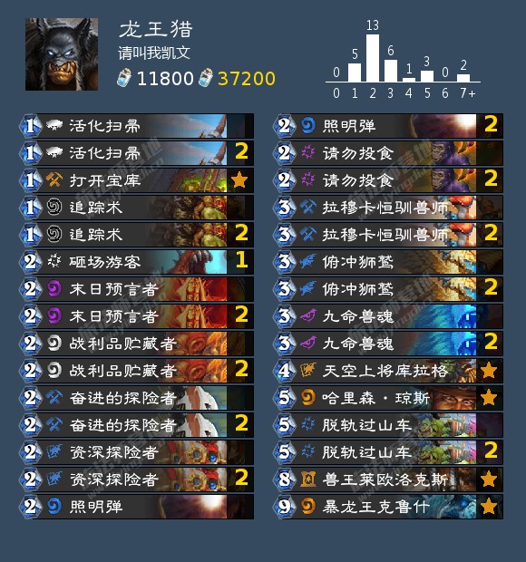 我相信兽王刚出的时候有很多玩家尝试过3龙王otk猎人,现在没有人玩的原因除了条件有些苛刻,还有一点是很怕对面有墙。我在思考龙王猎能处理所有墙的方法的时候猛然想到了砸场游客+扫把,甚至还有九命触发亡语的3费全驱,处理好墙的问题我们就只要专心收集otk就可以了,由于整套combo需要11费,所以加入任务体系拿硬币和过牌。