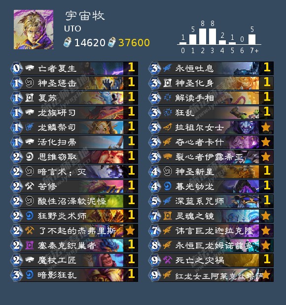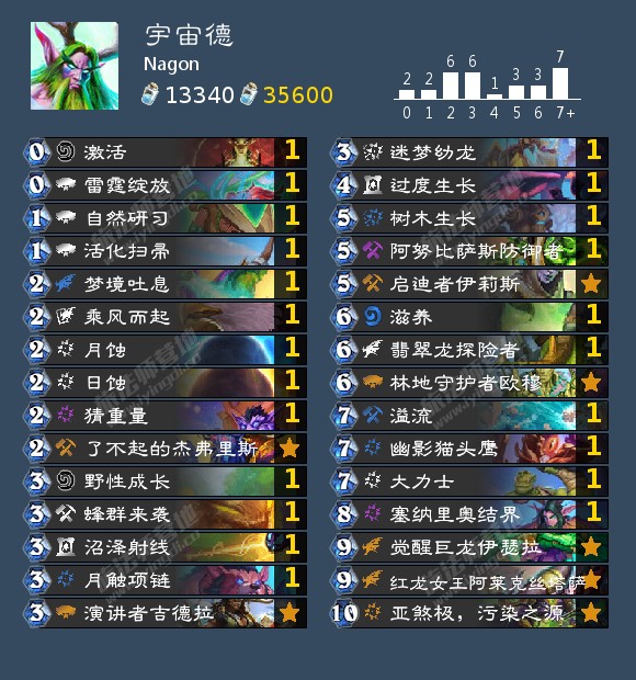 Nagon打到传说第2的宇宙德。迷你拓展包的新卡加强了宇宙德的中前期节奏,迷梦幼龙的加入让整个卡组的龙牌数量有四张,前期如果能配合到梦境吐息可以加快整个卡组的节奏。树木生长也是一张中期节奏很强的单卡,还能让阿努比萨斯防御者以0费打出压场,如果有雷霆绽放配合日蚀能制造一波更大的场面。
