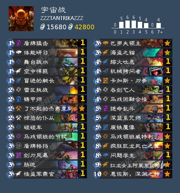 这套宇宙战的整体思路是比较偏防战的,满编了当前标准环境里战士大部分的解牌。过牌主要靠马戏领班威特利(起手需要留的一张牌)机械拷问者在对阵一些特殊职业的时候有奇效。卡组的后期质量由红龙女王和恩佐斯提供,这套宇宙战最大的问题是过牌能力很一般,起手要全力去找海盗之锚和马戏领班,在面对一些快攻卡组的时候前期需要找雷区挑战和剑刃风暴。