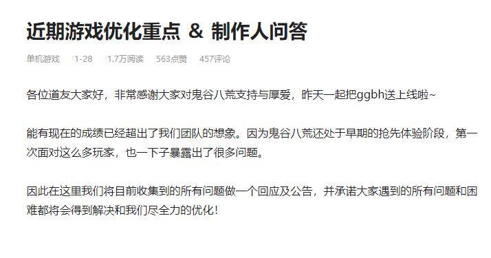 当然,研发团队也认识到了这些问题。无奈团队人数的限制导致鬼谷工作室目前只能专注于优化改进工作。“招人就算顺利,一般一时半会也不会那么快上手工作的,所以这3月的大版本还是得靠我们几个人肝。”从其B站官方账号发布的消息来看,短时间内游戏依旧很难增加一些较大的新内容。