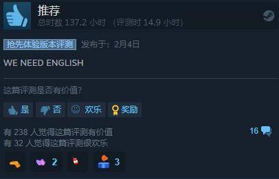 同时,在评论区中也不断传出“WE NEED ENGLISH”的呼吁。不少国外玩家表示,不需要加英文配音,只要加了英文字幕就会立刻买爆。甚至在一则发表于去年年底的英文评论下,已经积攒了逾百条“我们需要英文”的回复。显然,越来越多的国外玩家也正被这款纯正的修仙游戏所吸引。但遗憾的是,游戏目前仍仅支持简体中文。