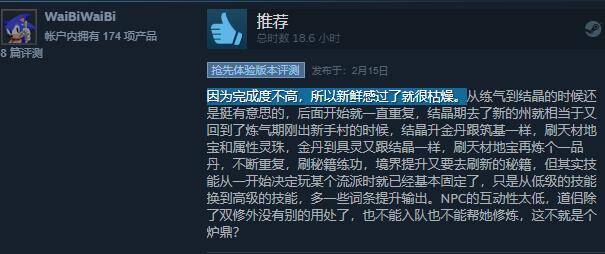 不少玩家坦言:“因为完成度不高,所以新鲜感过了就很枯燥。从练气到结晶的时候还是挺有意思的,后面开始就一直重复。”“后续同质化的刷刷刷,升一个境界,在几乎一样的地图里打换了名字的怪,刷换了名字的材料,学换了名字的功法。”
