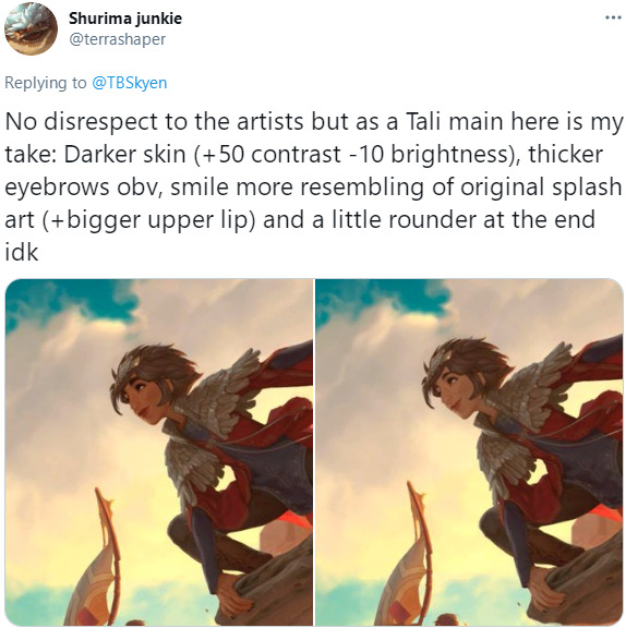 《英雄联盟》中的原版塔莉垭性情沉重,粗眉阔鼻,雀斑明显,声线较低且有口音。LoR目前发布的版本虽然很受新玩家喜爱,但让很多原版粉丝无法接受。拳头游戏承诺将会对原画进行调整,但赶不及在3月4日实装新版本前完工,会在后续版本中更新。