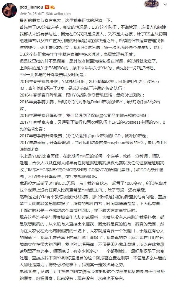 在长文中PDD先是对BO这个选手的情况做出回应,表示自己当时只是ESY的投资人,无论是初期组建阵容还是后续管理都参与很少,然后因为ESY高层管理有矛盾,其他老板因控制权在撕逼,所以PDD就撤资了。
