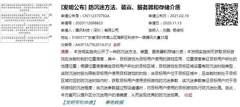 腾讯的这项发明可以获取目标游戏在当前时刻的位置信息,根据位置信息确定目标用户所处的目标区域,当目标用户位于目标区域中,且当前时刻处于目标区域对应的防沉迷时段内时,获取目标用户使用目标游戏的沉迷参数,当沉迷参数超过预设阈值时,对目标用户使用的目标游戏执行防沉迷处理。