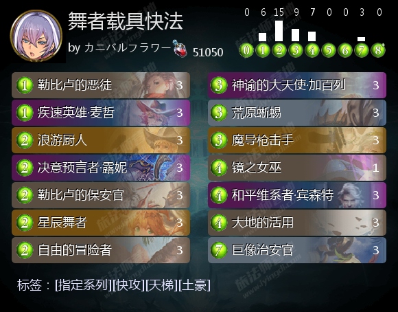 在各种低费载具制造者和Buff手段的支持下,载具法可以在前期频繁触发勒比卢的恶徒、疾速英雄·麦哲和浪游厨人的效果。第1回合麦哲接第2回合恶徒或麦哲,第1回合恶徒接第2回合星辰舞者,以及第1回合激奏巨像治安官接第2回合恶徒、麦哲或厨人等等,都是非常爆炸性的展开。如果对手未能及时拿出应对这些威胁的办法,载具法便可以通过载具制造者继续触发麦哲效果,或是通过神谕的大天使·加百列、大地的活用触发恶徒、厨人效果,滚雪球般的扩大优势,并快速抢血。