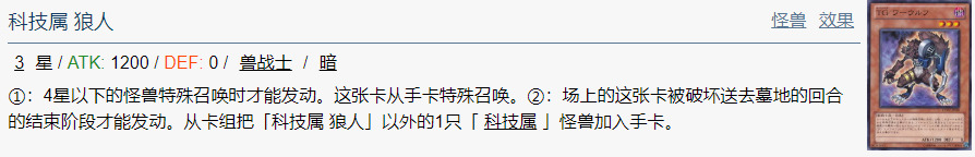①:4星以下的怪兽特殊召唤时才能发动。这张卡从手卡特殊召唤。②:场上的这张卡被破坏送去墓地的回合的结束阶段才能发动。从卡组把「科技属 狼人」以外的1只「 科技属 」怪兽加入手卡。