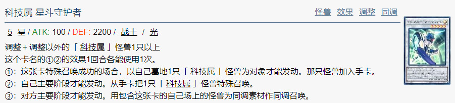 技能描述:将比自己场上1张TG调整同调怪兽等级一半或以下的TG同调怪兽从额外卡组中特殊召唤至场上,这个技能一辈子只能使用一次。