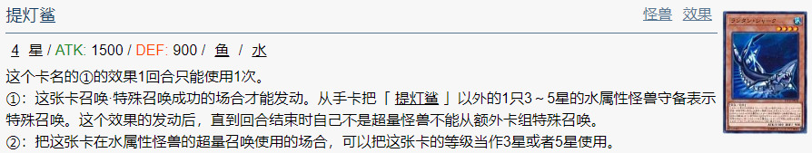 ①:这张卡召唤·特殊召唤成功的场合才能发动。从手卡把「 提灯鲨 」以外的1只3~5星的水属性怪兽守备表示特殊召唤。这个效果的发动后,直到回合结束时自己不是超量怪兽不能从额外卡组特殊召唤。