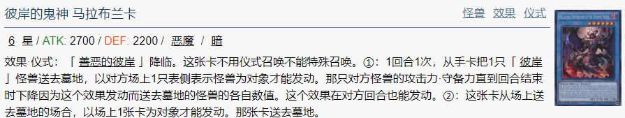 效果·仪式:「 善恶的彼岸 」降临。这张卡不用仪式召唤不能特殊召唤。①:1回合1次,从手卡把1只「 彼岸 」怪兽送去墓地,以对方场上1只表侧表示怪兽为对象才能发动。那只对方怪兽的攻击力·守备力直到回合结束时下降因为这个效果发动而送去墓地的怪兽的各自数值。这个效果在对方回合也能发动。②:这张卡从场上送去墓地的场合,以场上1张卡为对象才能发动。那张卡送去墓地。