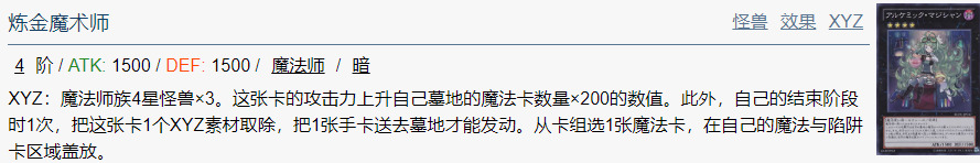 XYZ:魔法师族4星怪兽×3。这张卡的攻击力上升自己墓地的魔法卡数量×200的数值。此外,自己的结束阶段时1次,把这张卡1个XYZ素材取除,把1张手卡送去墓地才能发动。从卡组选1张魔法卡,在自己的魔法与陷阱卡区域盖放。