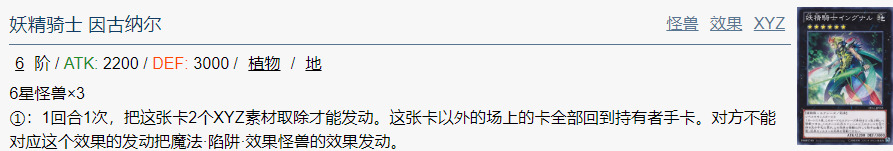 XYZ:8星怪兽×3。1回合1次,可以把这张卡1个XYZ素材取除,从以下效果选择1个发动。这个效果在对方回合也能发动。●选择对方场上盖放的1张魔法·陷阱卡才能发动。只要这张卡在场上表侧表示存在,选择的卡不能发动。●选择场上1只植物族怪兽变成里侧守备表示。●选择场上1只怪兽,那个攻击力上升300。