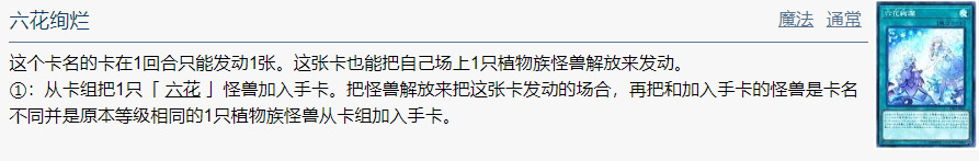 ①:从卡组把1只「 六花 」怪兽加入手卡。把怪兽解放来把这张卡发动的场合,再把和加入手卡的怪兽是卡名不同并是原本等级相同的1只植物族怪兽从卡组加入手卡。