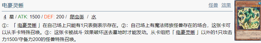 ①:「 电豪灵蜥 」在自己场上只能有1只表侧表示存在。②:自己场上有魔法师族怪兽存在的场合,这张卡可以从手卡特殊召唤。③:这张卡被战斗·效果破坏送去墓地时才能发动。从卡组把「 电豪灵蜥 」以外的1只攻击力1500/守备力200的怪兽特殊召唤。