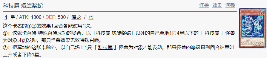 ①:这张卡召唤·特殊召唤成功的场合,以「科技属 螺旋桨蛇」以外的自己墓地1只4星以下的「 科技属 」怪兽为对象才能发动。那只怪兽效果无效特殊召唤。
