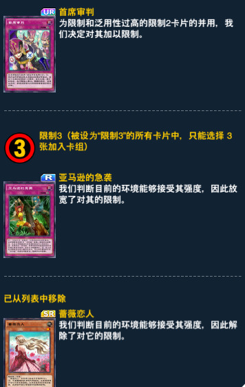 随着KC杯的结束,新一轮禁限制卡表和技能修正也来了。本次并没有像之前一样对卡片进行大规模的禁止和限制,反而是削弱了大量技能。