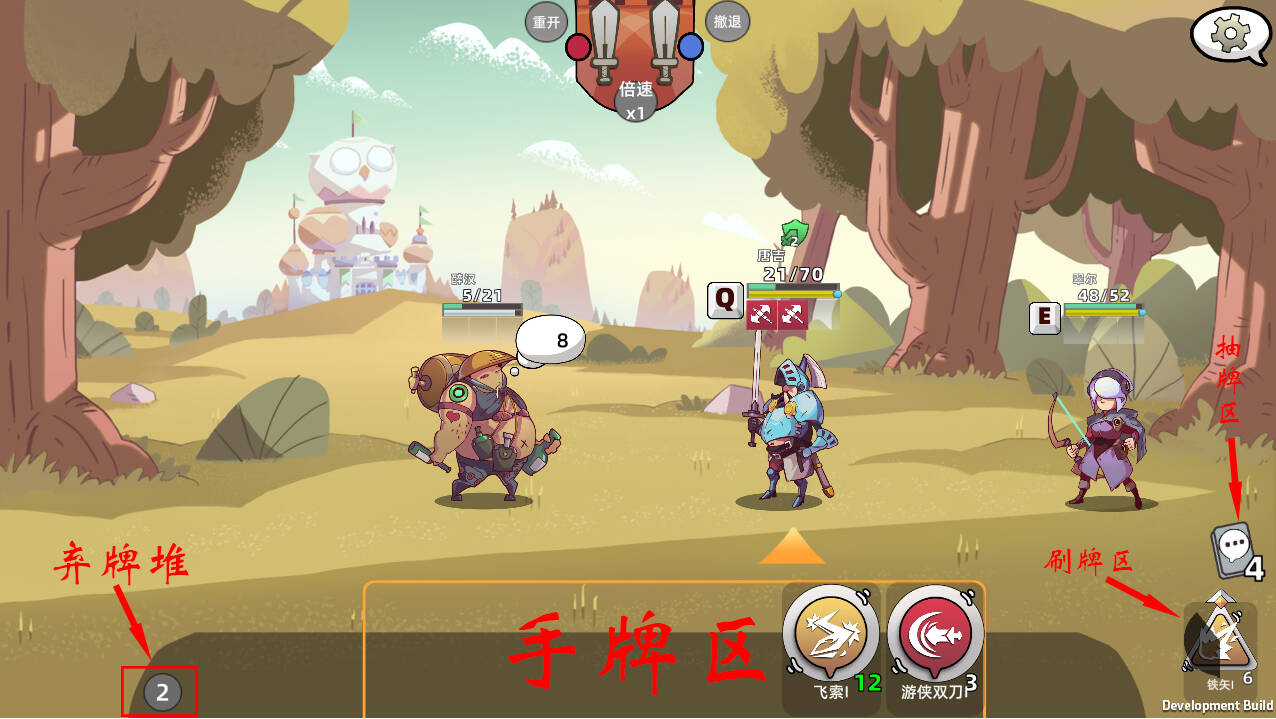 普通卡牌在使用后进入最左侧的弃牌堆,弃牌堆的数字代表其中的卡牌数量,等到抽牌区没有牌时,会把弃牌堆的牌打乱顺序重新放入抽牌堆构成一个循环;
