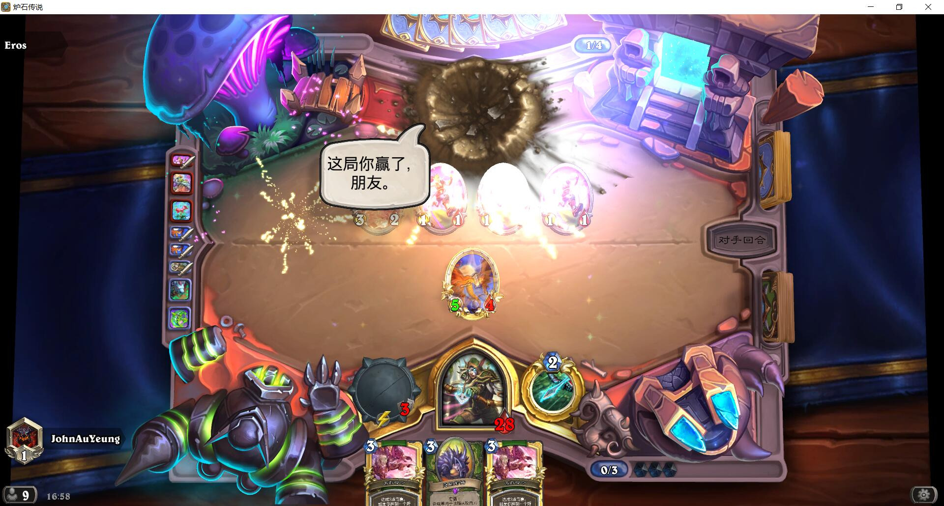 吸血瞎均势,其他大优,因为对局太少我也放一起讲;第一次遇到吸血瞎时对面三个莫尔葛工匠我没解…然后个位数的血被他一刀回满了,我才对这随从重视起来;没有什么对局经验,打脸就完事了;