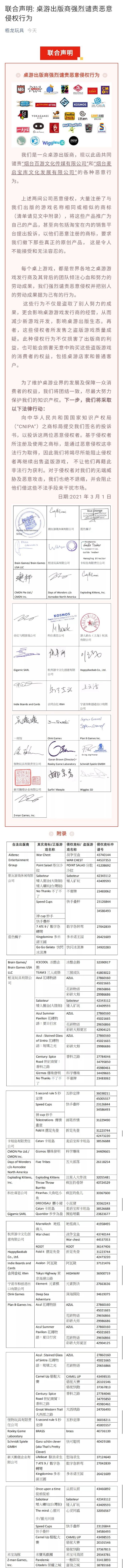 根据栢龙玩具官方公众号公布的相关消息,栢龙玩具联合国内其他桌游出版商共同谴责某两家公司的各种恶意侵权行为,这两家公司大量注册了与出版游戏名称相似或相同的商标,并推广为自己的产品,甚至倒打一耙要求原出版商下架真正的原创产品。